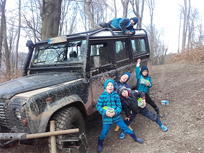 Mit allen Kindern zusammen im Landrover die Schätze von Soldat August suchen.