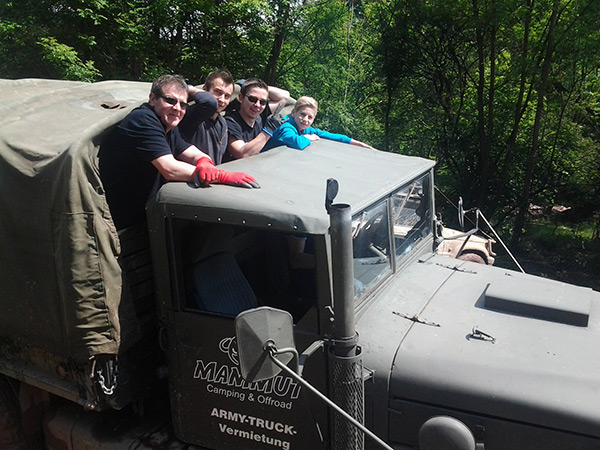 Geländewagen in einem 6×6 Army Truck. Unter der Anleitung eines erfahrenen Ausbilders gelangen Sie durch das Mammut-Gebiet. Es können auch weitere Personen hinzukommen.Kosten: 130,00 Euro pro Stunde